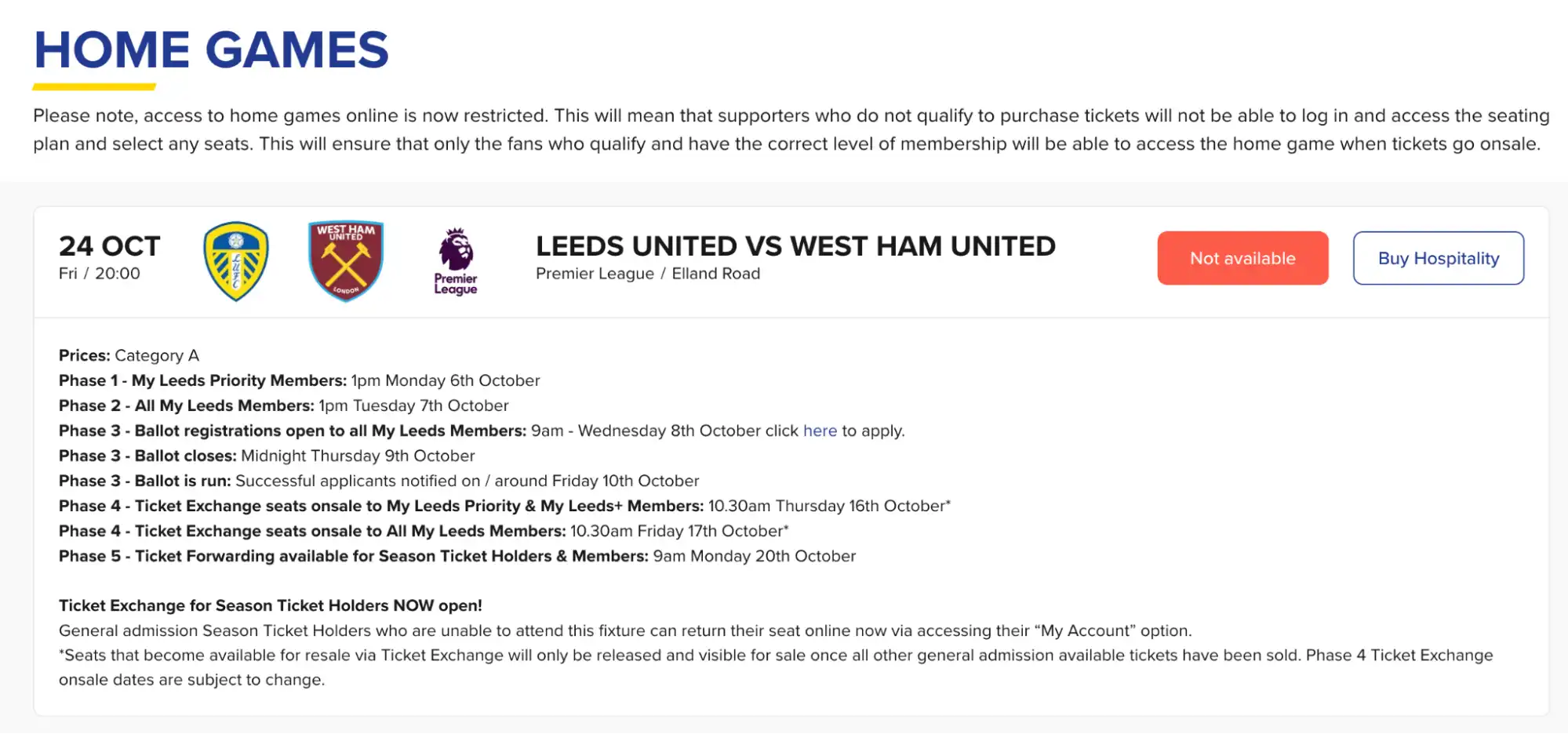 | 4A | חמישי, 10:30 (שבוע אחרי) | Priority & My Leeds+ | מושבים מ-Ticket Exchange משתחררים לחברים בכירים. |