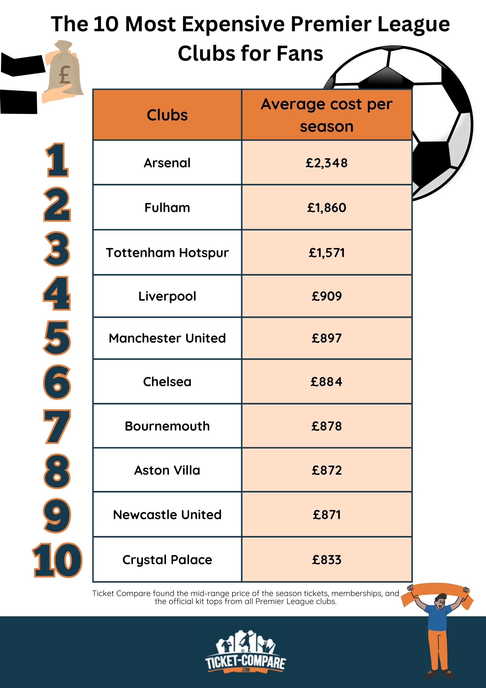 למרות שסיימה במקום השני בעונה הקודמת, Arsenal היא המועדון היקר ביותר לאוהדים! המחיר כולל את דמי החבר הגבוהים ביותר ($1,130) וחולצה רשמית ב-$131.